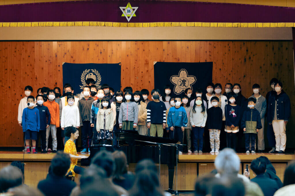 卒業式前日「希望のピアノ」復興式典/西村由紀江さんと渡小学校校歌を歌う子どもたち